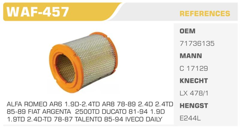 Hava filtresi, motorun performansı ve ömrü açısından kritik bir bileşendir. Alfa Romeo AR6 1.9D-2.4TD ve AR8 78-89 2.4D 2.4TD, Fiat Argenta 2500TD, Ducato 81-94 1.9D, 1.9TD, 2.4D-TD, Talento 85-94 ile Iveco Daily modellerinde kullanılmak üzere tasarlanmış olan bu hava filtresi, aracınızın motorunun en verimli şekilde çalışmasını sağlar.