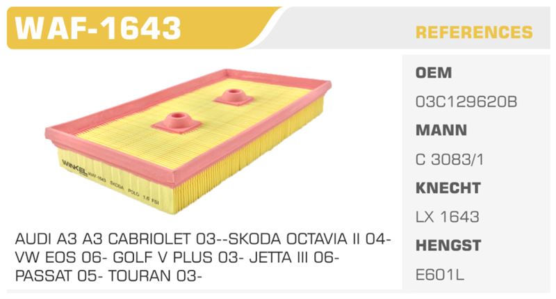 - Model Uyumu: Bu hava filtresi, Audi A3, A3 Cabriolet (03-), Skoda Octavia II (04-), VW EOS (06-), Golf V Plus (03-), Jetta III (06-), Passat (05-), ve Touran (03-) model araçlarla %100 uyumludur.
