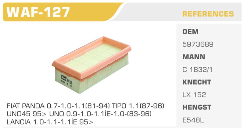 - Uyumlu Modeller: Hava filtresi, Fiat Panda (0.7, 1.0, 1.1 - 1981-1994), Fiat Tipo (1.1 - 1987-1996), Fiat Uno (45 - 1995'ten sonra), Fiat Uno (0.9, 1.0, 1.1 IE - 1983-1996) ve Lancia (1.0, 1.1, 1.1 IE - 1995'ten sonra) gibi modellerle mükemmel uyum sağlar.