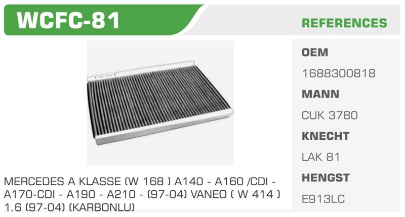 POLEN FİLTRESİ MERCEDES A KLASSE (W 168) A140 - A160 /CDI A170-CDI - A190 - A210 (97-04) VANEO (W 414) 1.6 (97-04) (KARBONLU)