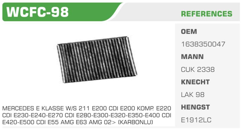 Ürün Adı: POLEN FİLTRESİ MERCEDES E KLASSE W/S 211 E200 CDI E200 KOMP. E220 CDI E230-E240-E270 CDI E280-E300-E320-E350-E400 CDI E420-E500 CDI E55 AMG E63 AMG 02> (KARBONLU)