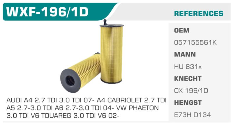 Yağ Filtresi - AUDI A4 2.7 TDI 3.0 TDI (07-), A4 Cabriolet 2.7 TDI, A5 2.7-3.0 TDI, A6 2.7-3.0 TDI (04-), VW Phaeton 3.0 TDI V6, Touareg 3.0 TDI V6 (02)