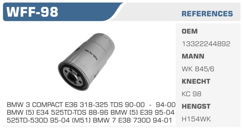 YAKIT FİLTRESİ BMW 3 COMPACT E36 318-325 TDS 90-00, BMW 5 E34 525TD-TDS 88-96, BMW 5 E39 525TD-530D 95-04 (M51), BMW 7 E38 730D 94-01